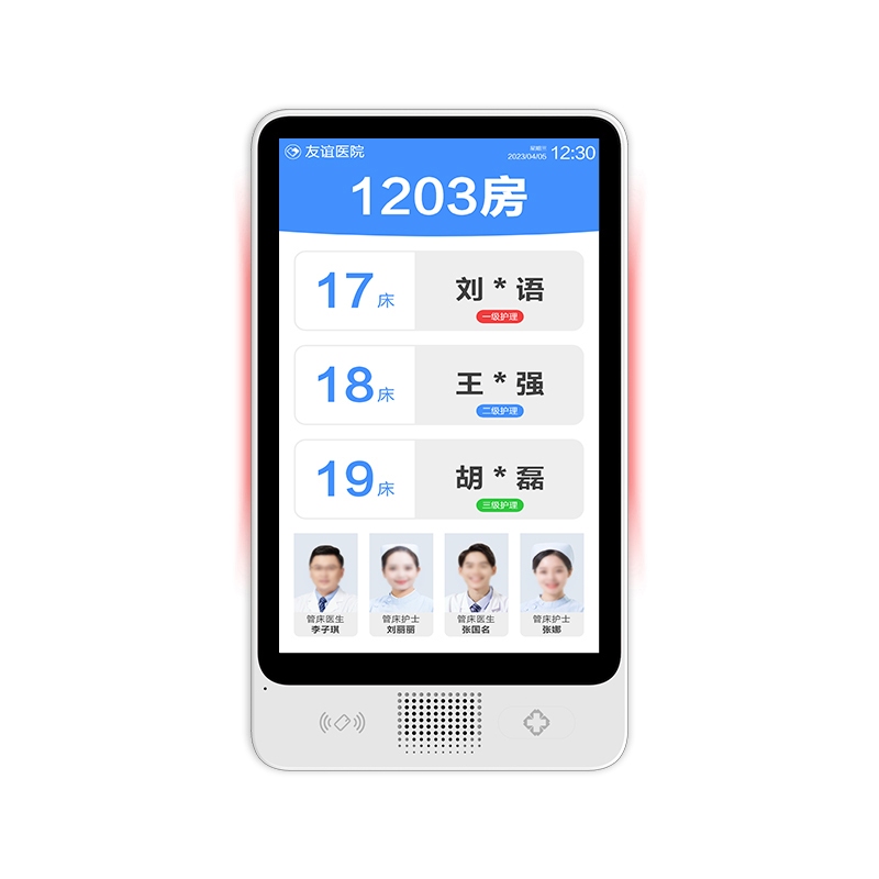 • 采用10.2英寸高清液晶显示屏,内置灯带双侧发光设计,壁挂式安装在病房门口。