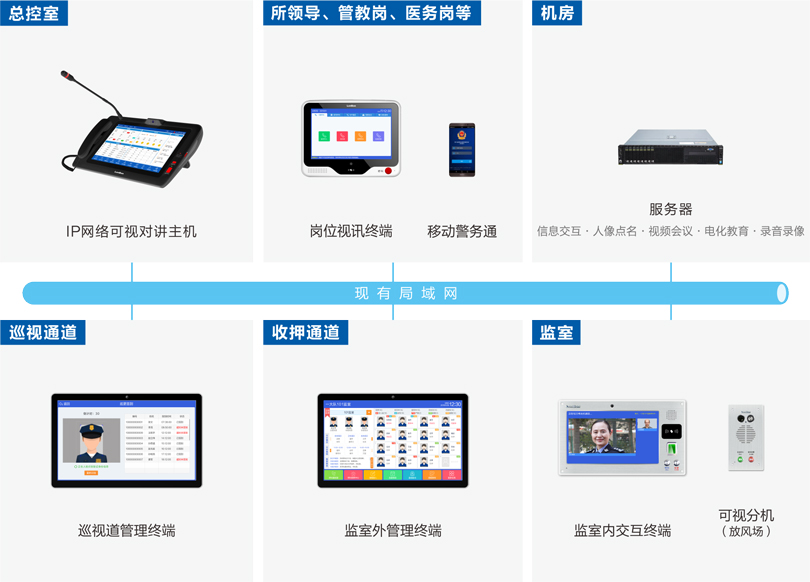 来邦监室智能交互系统 主要包括监室内交互终端、监室外管理终端、巡视道管理终端,供监所民警和被监管人员使用,具有可视对讲、信息展示、交互管理、信息采集等功能,并支持与实战平台对接。
