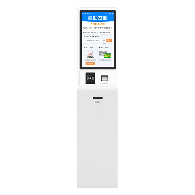 • 采用21.5英寸触摸屏,落地式摆放在等候区,为患者提供签到取号、队列查询服务。