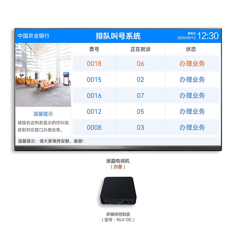 • 具有显示票号信息、窗口信息、业务状态、播放视频、显示文字通知、接收信息发布、HDMI输出等功能。