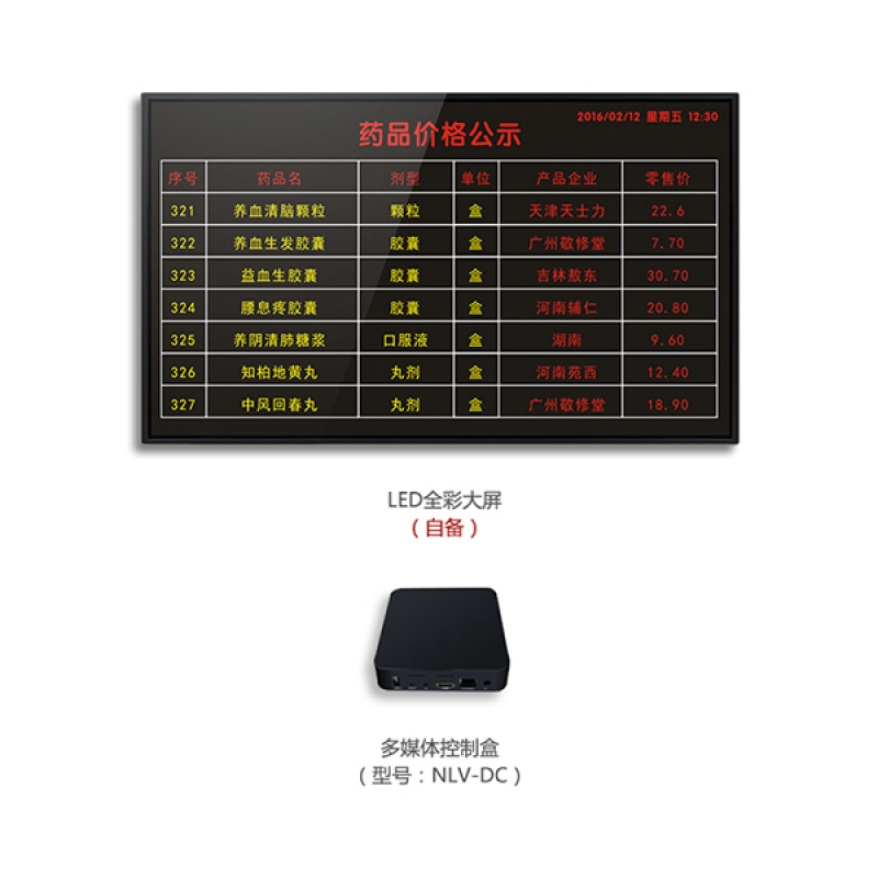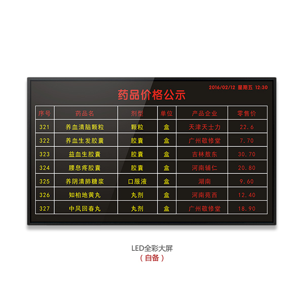 • 可显示药品名称、规格、制药公司、价格、数字时钟等信息,支持翻页显示。