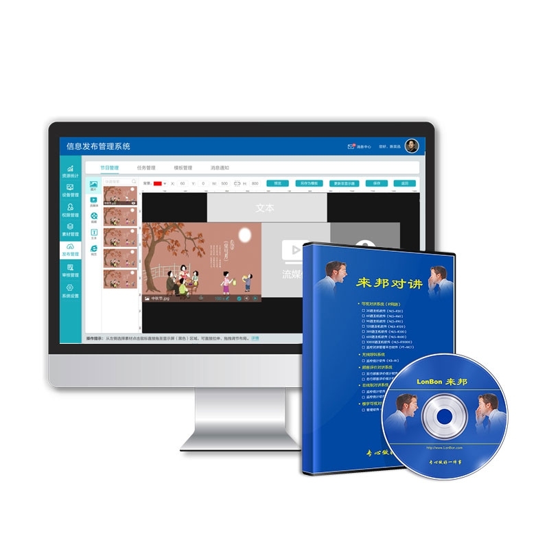 • 支持在线编辑发布内容,单一画面可叠加播放多种素材,并可在线预览播放效果。