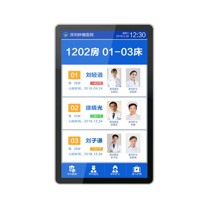 信息显示:支持显示病房号、床位号、患者信息、责任医生护士的姓名及照片等。