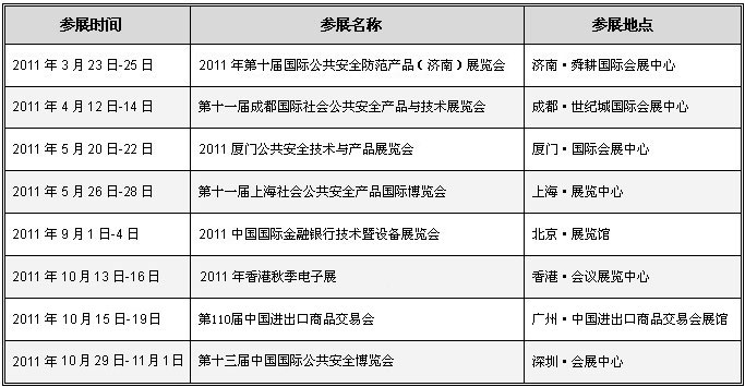 新闻中心 2011厦门公共安全技术与产品展览会将于2011年5月20日-22日在福建省厦门市举办,届时我公司参加,欢迎新老顾客莅临、参观指导。